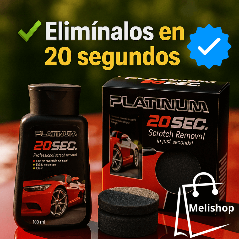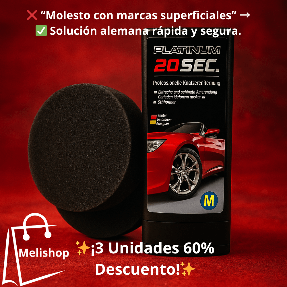 No importa si son pequeños arañazos en la puerta, marcas al estacionar o roces superficiales, esos detalles quitan brillo y valor a tu vehículo. ¡Pero no más! Con Platinum 20 Seg, la crema reparadora alemana, puedes eliminar rayones en solo 20 segundos y recuperar el acabado impecable de fábrica sin gastar una fortuna en talleres.